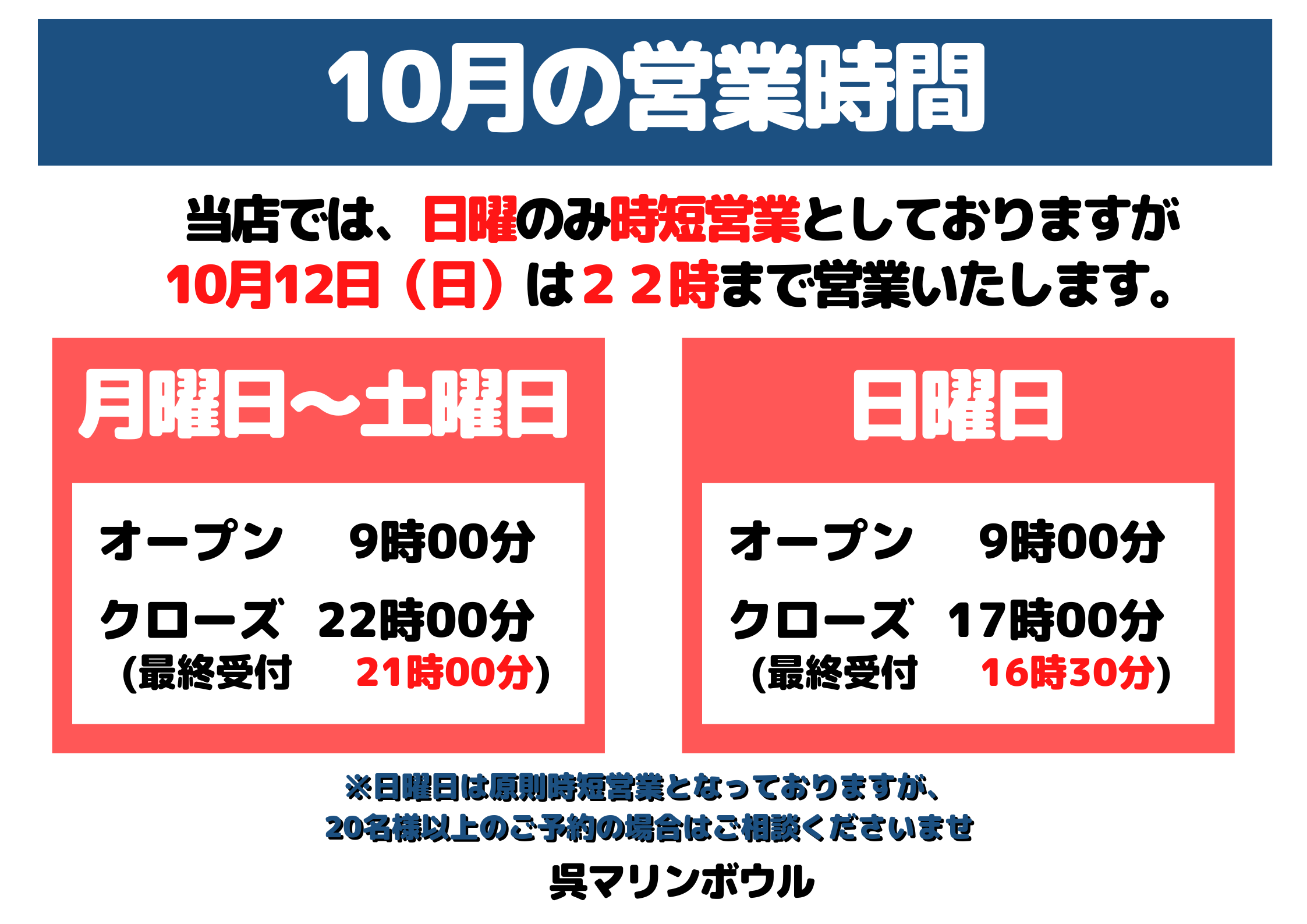16時最終受付案内 【お知らせ】 平素より呉マリンボウルをご利用いただき、誠にありがとうございます。 2025年7月13日(日)は、社員研修のため、16:00を最終受付とさせていただきます。お客様にはご不便をおかけいたし… 続きを読む 7月13日(日)は社員研修の為16時最終受付となります